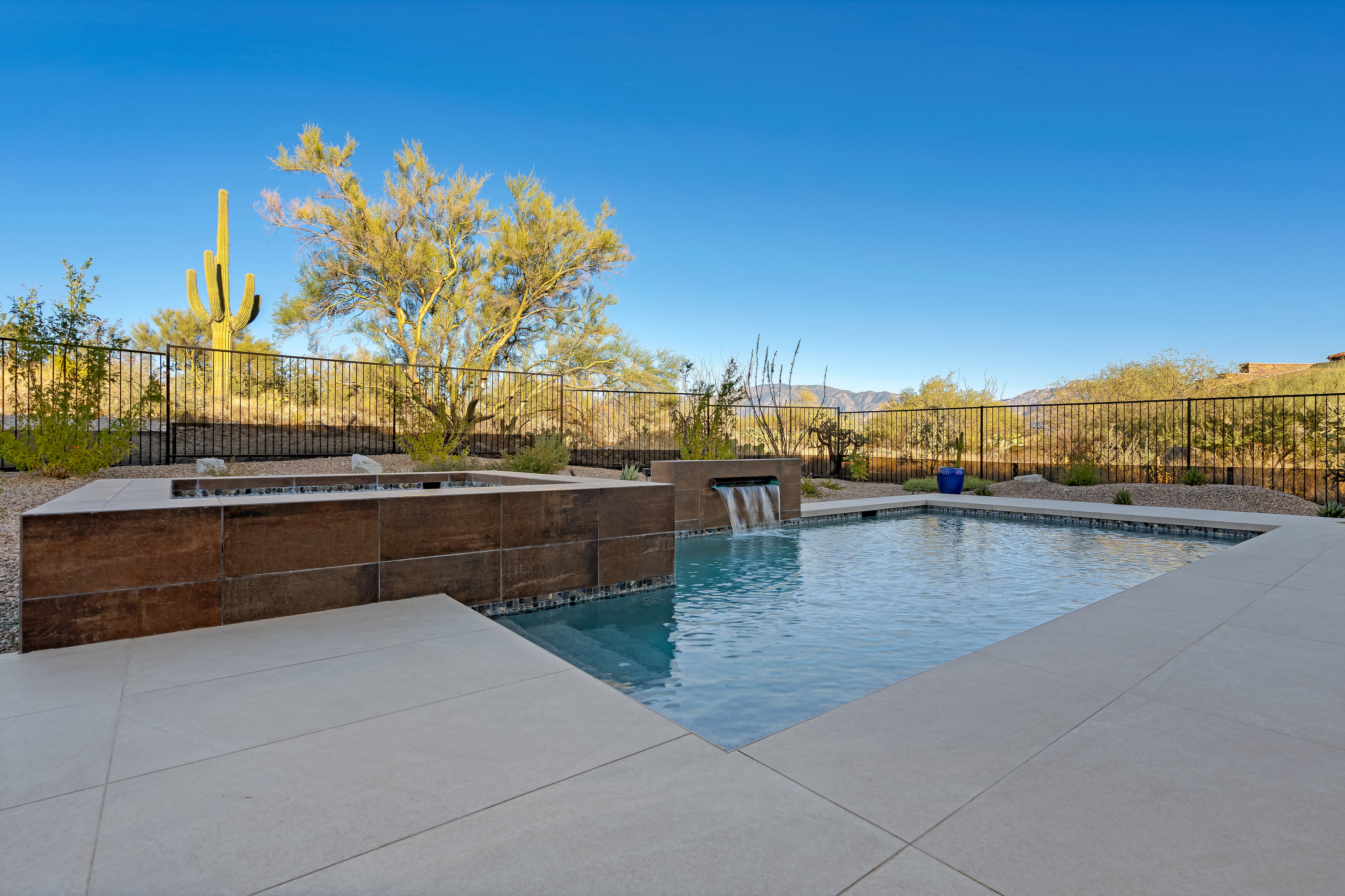 This backyard was designed as a calming, modern escape in natural desert surroundings. The homeowners desired a clean, symmetrical layout that offered privacy, quiet, and a soft visual feel. The design integrates a pool and spa, water feature, covered patio, and outdoor kitchen — all arranged to support both quiet moments and family gatherings. Materials and layout were selected to support a sense of openness — both visually and in daily use.